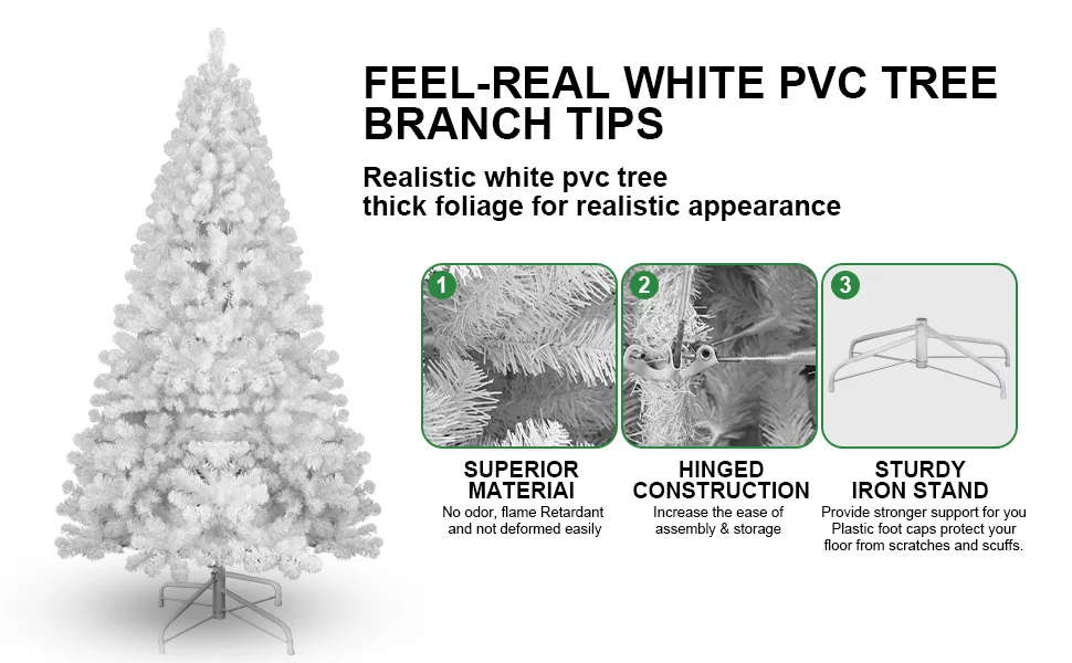 Crafted from durable, eco-friendly PVC and PE materials, our artificial Christmas tree is made to endure for years. Whether displayed indoors by the fireplace or outdoors in your yard, its sturdy construction ensures it remains beautiful and reliable for countless holiday seasons, all while being kind to the planet.