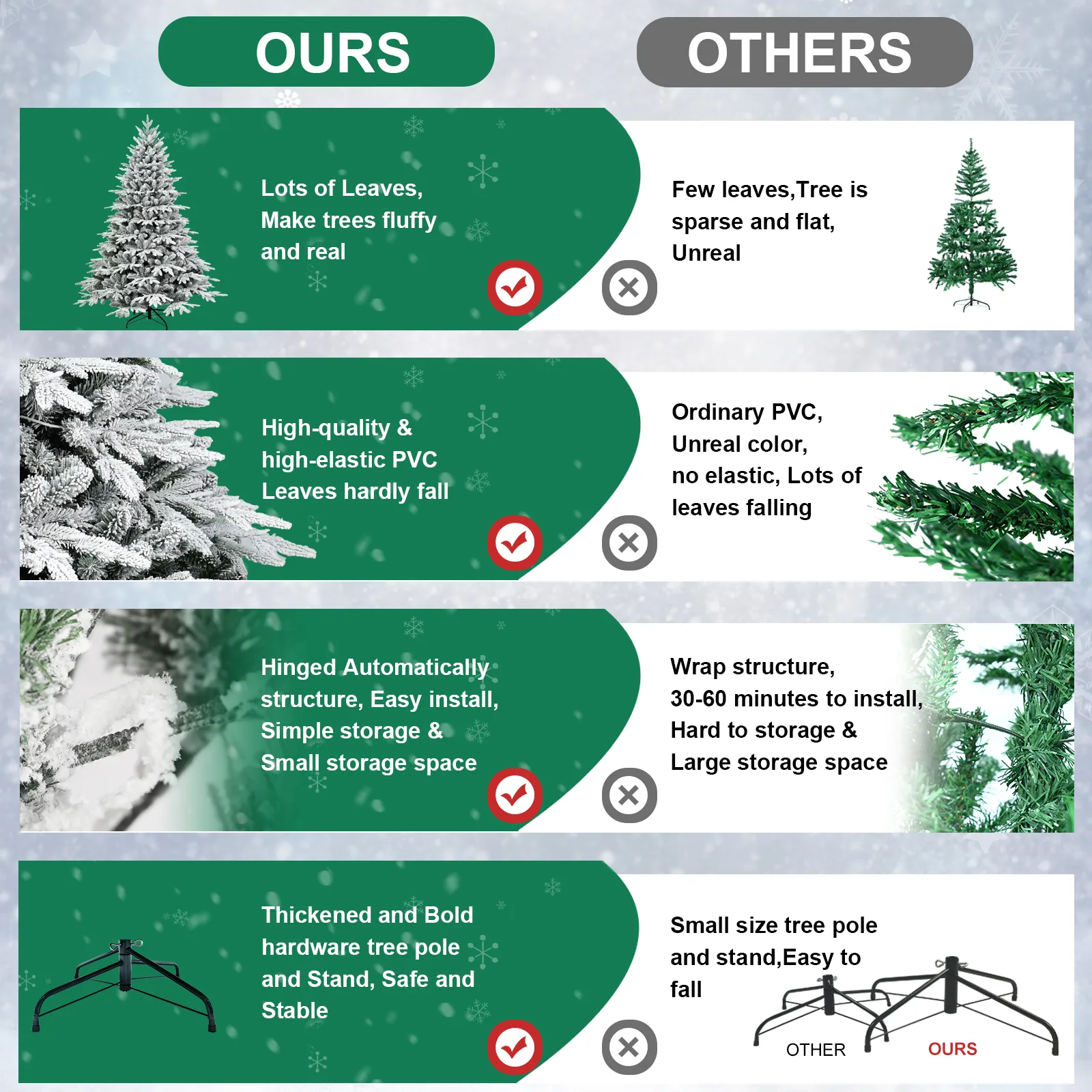 Say goodbye to the hassle of arranging branches! With NONUO’s Self-Collapsing Branches, simply stand the tree upright, and the branches fall into place. For storage, just flip the tree upside down and the branches collapse for easy packing.